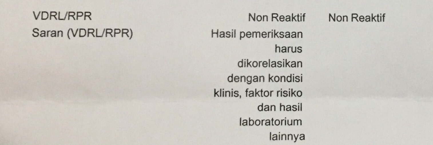 - VDRL/RPR : Mendeteksi ada tidaknya penyakit menular seksual