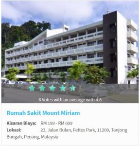 Sementara itu, untuk melihat daftar rumah sakit dan perkiraan biaya yang akan kita keluarkan, kita bisa mengakses menu RUMAH SAKIT. Pada menu ini terdapat informasi rumah sakit yang berada di Penang, fasilitas & layanan yang diberikan setiap rumah sakit, biaya & paket yang ditawarkan, serta lokasi rumah sakit tersebut berada. Misalkan kita tertarik dengan rumah sakit tertentu, kita juga dapat melihat rating rumah sakit tersebut berdasarkan pengalaman orang lain yang pernah datang sebelumnya.